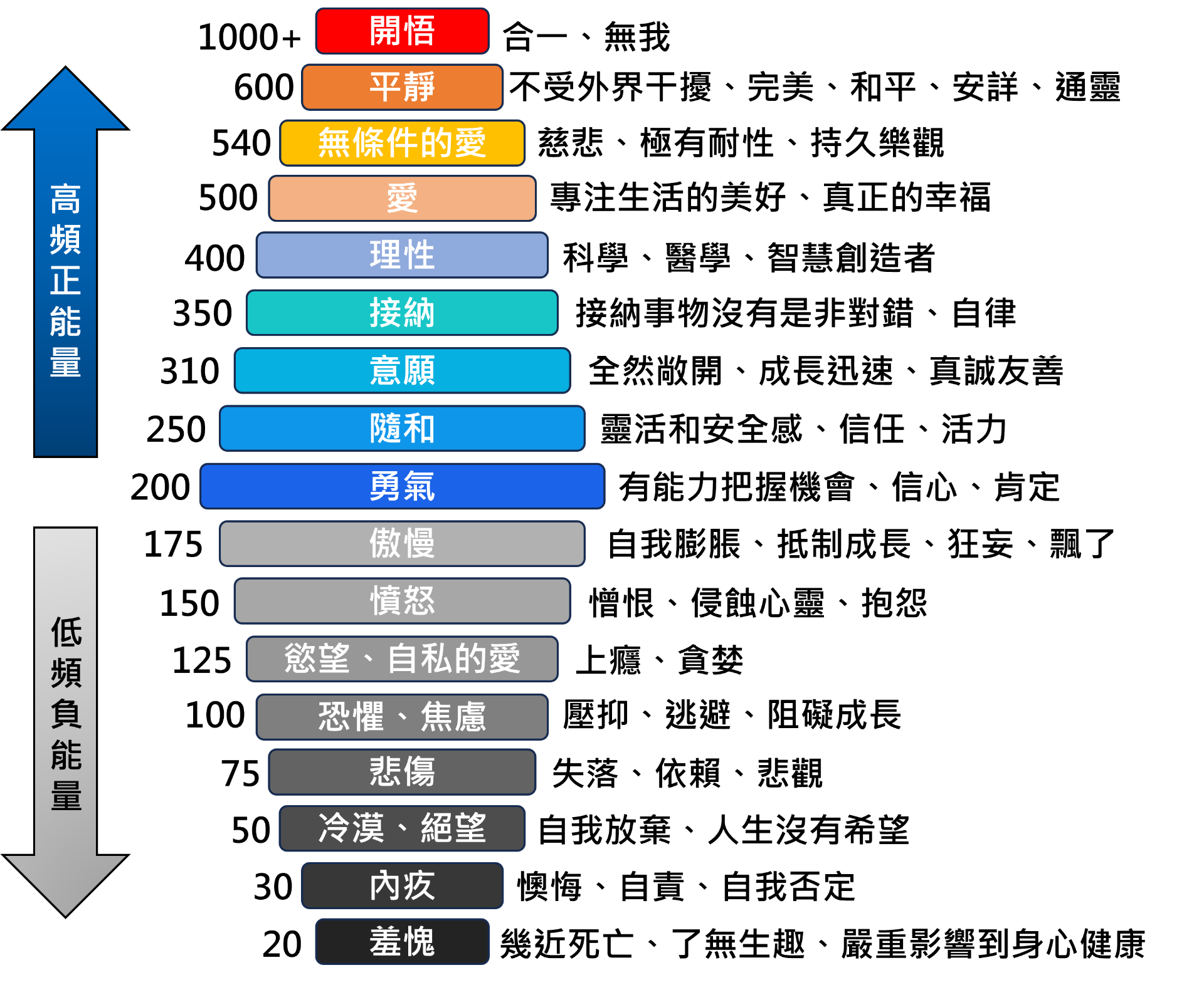 高頻正能量層級:愛(500)、喜悅(540)、平靜(600)